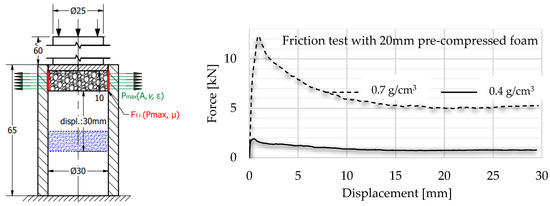 In this study, to obtain a relevant comparison between free and radial-constrained tests, the ISO13314:2011 standard was applied and taken into consideration. The standard characterises the method of calculation of plateau stress, plateau zone and the starting strain of densification concerning the free compression test, but there is no determination of conditions of the radial-constrained load, materials and friction parameters. Therefore, further friction tests were necessary to obtain a meaningful answer on the effect of radial forcing.