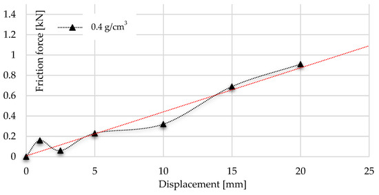 Trend of frictional resistance during multiaxial test using foam with a density of 0.4 g/cm3 with trendline.