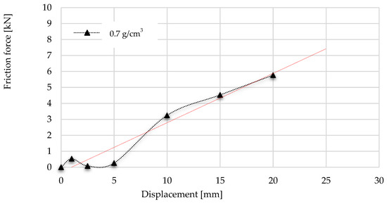 Trend of frictional resistance during multiaxial test using foam with a density of 0.7 g/cm3 with trendline.