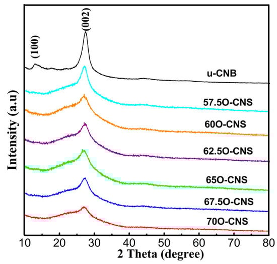 The effect of the amount of H2O2 on the crystal structure of the as-obtained samples was analyzed by XRD and the results are shown in Figure 1. It can be seen that the u-CNB sample exhibited two clear and sharp diffraction peaks near 13.2° and 27.8°, corresponding to the (100) and (002) crystal planes of the g-C3N4, respectively [19,20]. However, after incorporating O atoms into the g-C3N4 crystal, the diffraction peaks at 13.2° for all O-CNS samples disappeared. In addition to the above, the diffraction peak around 27.8° of the O-CNS samples became wider and weaker than that of u-CNB, and the intensity gradually decreased with the increase in H2O2 content, suggesting that the introduction of O atoms affected the structure of g-C3N4 crystals.