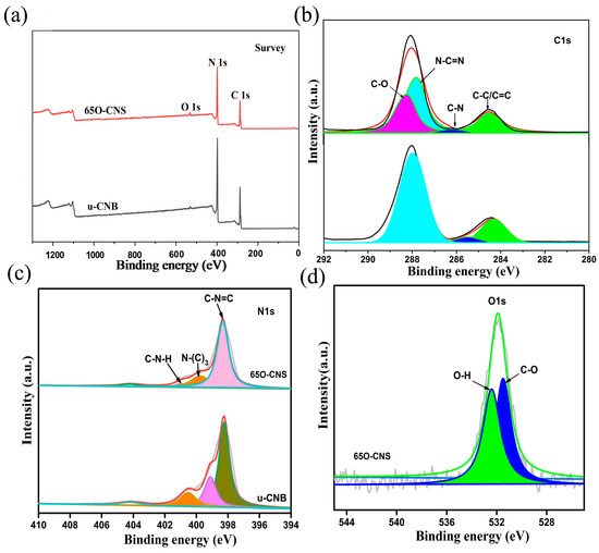 As presented in Figure 2, the elemental composition and chemical status of the synthesized samples were characterized by XPS. From the survey spectra (Figure 2a), three strong signals for C, N and O elements appeared for the 65 O-CNS sample, indicating the existence of the O element. The weak signal of O 1s in u-CNB mainly originated from the adsorbed oxygen in the XPS measurement. Interestingly, the intensity of the C 1s and N 1s peaks in the 65 O-CNS sample was weaker than that in u-CNB, presumably due to the doping of the O element. Figure 2b–d show the high-resolution XPS spectra. Two dominant peaks for C 1s are situated around 284.6 and 288 eV (Figure 2b), which could be deconvoluted into four peaks centered at 288.2, 287.8, 286.2 and 284.5 eV, respectively, originating from C=O groups, N-C=N groups, C-N groups and C-C/C=C groups. The high-resolution spectrum of N 1s could be deconvoluted into four smaller peaks with binding energies of 398, 399.6, 400.8 and 404.2 eV (Figure 2c), respectively, ascribed to N (C-N=C) groups (sp2 bonded), tertiary nitrogen N-(C)3 groups, C-N-H amino groups and charging effect [21]. Figure 2d displays the high-resolution spectrum of O 1s of the 65 O-CNS sample, which could be deconvoluted into two peaks centered at 531.5 and 532.5 eV, respectively, attributed to the bond of C-O and O-H [22,23]. In summary, the results mentioned above provide strong proof for the presence and chemical status of O ions in the 65 O-CNS sample. Additionally, vacancy defects could be correspondingly formed to compensate for the valence difference between N ions and O ions.