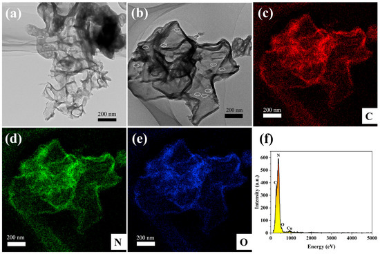 The morphological structure of the 65 O-CNS photocatalyst was further examined by TEM and STEM images. As observed in Figure 4a, the 65 OCNS sample consisted of a mass of nanosheets with a relatively thin thickness of approximately 10 nm. Furthermore, it is clear from the magnified image (Figure 4b) that some irregular pores were distributed throughout thin nanosheets, resulting in the formation of a porous structure, which is beneficial for acquiring a large specific surface area. The formation of the porous structure was presumably associated with the bubbles produced during the polycondensation process with the assistance of H2O2. Therefore, one could come to the conclusion that the introduction of H2O2 indeed regulated the morphological structure. The element distribution of 65 O-CNS was revealed by high-angle annular dark-field (HAADF) and energy dispersive X-ray spectroscopy (EDS) element mapping, as illustrated in Figure 4c–f. It is clear that C, N and O elements (Figure 4c–f) were uniformly distributed throughout the 65 O-CNS sample, which further confirms the presence of the O element in the 65 O-CNS sample. As for the Cu element, it came from copper mesh in the sample preparation. Based on the above analysis, it can be concluded that the oxygen-doped C3N4 thin nanosheets with a porous structure were successfully prepared with H2O2 as the dopant source.