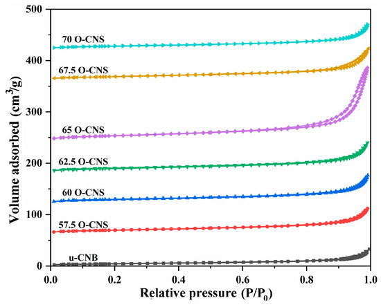 Figure 5 shows the N2 adsorption–desorption isotherms of u-CNB and different O-doped C3N4 samples. Obviously, the N2 adsorption–desorption isotherm for the O-doped C3N4 samples with a higher N2 volume adsorbed at high P/P0 were classified as type IV isotherms with H3 hysteresis loops, manifesting the mesoporous nature of the resulting sample. However, for the u-CNB sample, the lower volume of N2 adsorbed at high P/P0 was perhaps ascribed to the severe agglomeration of block-like particles [24]. Table 1 shows the specific surface area and pore size distribution of u-CNB and different O-doped C3N4 samples. Among them, u-CNB had the smallest specific surface area, attributable to the blocky structure formed by severe stacking of layers, while the 65 O-CNS sample possessed the largest specific surface area due to the nanosheets stacking. The increase in the specific surface area of the 65 O-CNS sample most likely increased the active sites for the catalytic reaction, which would facilitate the significant improvement in photocatalytic hydrogen production performance.