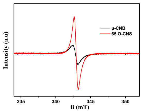 The unpaired electrons of the prepared u-CNB and 65 O-CNS samples were tested by using electron paramagnetic resonance (EPR) at an ambient temperature and the result is shown in Figure 7. In the magnetic field from 333 to 353 mT, the u-CNB and 65 O-CNS samples had only one Lorentz curve centered around a g value of 2.003, which was considered a lone pair of electrons in sp2 hybrid carbon in g-C3N4 [28]. Moreover, the EPR signal intensity of the 65 OCNS sample was much higher than that of u-CNB, suggesting that more unpaired electrons in the 65 O-CNS sample would be generated under illumination. The result of EPR also revealed that the recombination of photogenerated electron–hole pairs for the 65 O-CNS sample was substantially inhibited, as compared with that of u-CBN.