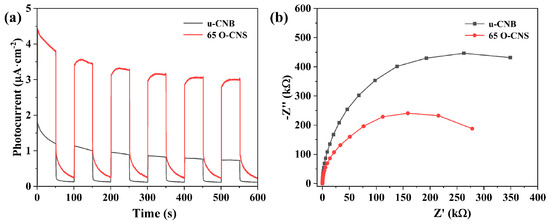 As a previous research work has demonstrated [25], the photocurrent response of semiconducting photocatalysts is capable of reflecting the transfer and separation of photoexcited electrons and holes. The migration rate of photogenerated electron–hole pairs in the u-CNB and 65 O-CNS samples were further analyzed through electrochemical measurement. As presented in Figure 8a, a rapid and reversible photocurrent response sprouted for the u-CNB and 65 O-CNS samples, indicating their stability and reproducibility. The photocurrent density of the 65 O-CNS sample was much larger than that of u-CNB, signifying that the migration rate of photogenerated carriers of the 65 O-CNS sample was much higher than that of u-CNB. The above result also confirmed the remarkable elevation in the separation and migration rate of photoexcited carriers. Figure 8b presents the Nyquist plots of the electrochemical impedance spectra (EIS) for the u-CNB and 65 O-CNS samples. According to previous studies [29,30,31], the smaller the radius of the curve, the smaller the internal resistance. As expected, the impedance of the 65 O-CNS sample was smaller than that of u-CBN, revealing that more excited carriers could successfully migrate to the interface due to the restriction of carrier recombination. This result of the EIS was also in good accordance with the results of the photocurrent analysis. Based on the above, we can draw a conclusion that the migration rate of photogenerated carriers of the 65 O-CNS sample was remarkably accelerated and the recombination rate of photogenerated electron–hole pairs decreased significantly due to O doping.