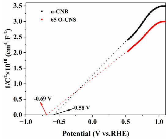 In order to further investigate the enhancement mechanism of the photocatalytic activity of oxygen-doped C3N4, Mott–Schottky (M-S) plots of the u-CNB and 65 O-CNS samples were created and are depicted in Figure 10. The M-S plots of u-CNB and 65 O-CNS exhibit positive slopes, indicating the typical characteristics of n-type semiconductors. Based on the interception on the horizontal axis in the M-S plots, the flat potentials of u-CNB and 65 O-CNS were calculated to be −0.58 eV and −0.69 eV (vs. NHE), respectively. The 65 O-CNS sample showed a more negative flat band potential than u-CNB, indicating a larger amount of electron accumulation and a faster separation rate of photogenerated carriers in the 65 O-CNS photocatalyst. For n-type semiconductors, the potential of the flat band is about 0.2 eV more positive than that of the conduction band (CB) [38]. Therefore, the conduction band of u-CNB and 65 O-CNS was estimated to be −0.78 eV and −0.89 eV (vs. NHE), respectively. Combined with the UV–vis DRS results above, the valence band (VB) of the u-CNB and 65 O-CNS samples was calculated to be 1.84 eV and 1.61 eV (vs. NHE), respectively.