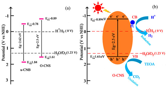Based on the above calculation, the position of ECB and EVB can be determined and the schematic diagram for the band structure of u-CNB and 65O-CNS catalysts is presented in Figure 11a. It is obvious that the ECB of O-CNS shifted upward from −0.78 V vs. NHE for U-CNB to −0.89 V vs. NHE for 65 O-CNS. Undoubtedly, a higher CB energy position would result in the promotion of the reduction capacity, and the decrease in Eg would lead to the enhancement of the visible light absorption capacity [39]. In light of the above demonstration, a proposed mechanism for the enhancement of photocatalytic behavior is schematically portrayed in Figure 11b. Upon exposure to visible light irradiation, the electrons (e−) in O-CNS are excited and migrate from the VB to CB, leaving holes in the VB (h+). Then, the excited electrons transfer from the CB of O-CNS to the surface of Pt particles. The accumulating electrons on the surface of Pt particles combine with hydrogen ions to produce H2. At the same time, TEOA is oxidized to form CO2 by photogenerated holes during the oxidation reaction process. The possible reaction equations involved in photocatalytic hydrogen evolution are as follows: