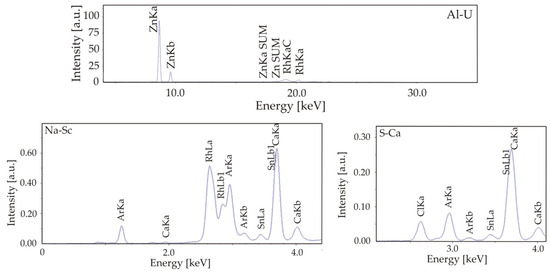 Additional tests on the chemical composition of the deposited thin films were carried out using the SHIMADZU (Kioto, Japan) EDX-7000 X-ray fluorescence spectrometer. X-ray fluorescence spectrometry (XRF) is an analytical technique that uses the characteristic X-ray radiation emitted by elements as a result of excitation with higher energy X-rays. At 4 kV (4000 eV), the wavelength is approximately 0.31 nm. At 50 kV (50,000 eV), the wavelength is approximately 0.025 nm. Thus, the EDX-7000 can detect X-ray wavelengths in the range of about 0.025 to 0.31 nm (25 to 310 pm).
