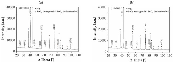 Furthermore, the results of X-ray phase analysis verified that SnO2 phases in two varieties of the crystal lattice—tetragonal and orthorhombic—were detected in the studied thin films applied to MgCa2Zn1 and MgCa2Zn1Gd3 alloys (Figure 3). The diffraction patterns showed characteristic peaks at 31.544, 40.035, 45.213, 61.958, 74.860, and 79.945 degrees of the 2θ angle for the SnO2 assigned to the tetragonal crystal lattice (JCPDS card No. 98-005-6674) and also showed peaks at 24.794, 39.848, 40.086, 53.732, 56.020, and 98.870 degrees of the 2θ angle for the SnO2 assigned to the orthorhombic crystal lattice (JCPDS card No. 98-018-1282) deposited onto Mg-based alloys. The phase analysis indicates that the SnO₂ has a dominated rutile structure (space group P 42/m n m; space group no. 136; lattice parameters: a = 4.6540 Å, b = 4.6540 Å, c = 3.1580 Å).