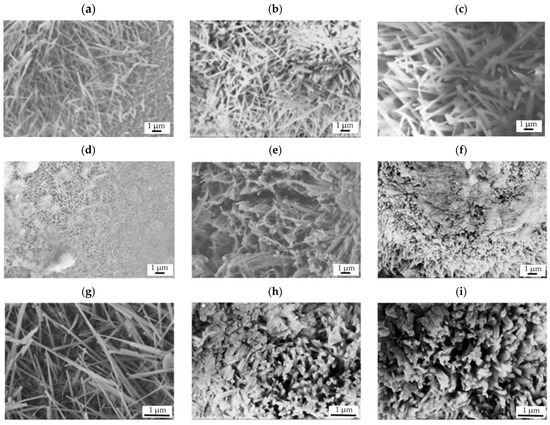 SEM images of SnO2 thin films deposited on MgCa2Zn1 alloy after (a) 1000, (b) 1500, and (c) 2000 cycles and on MgCa2Zn1Gd3 alloy after (d,g) 1000, (e,h) 1500, and (f,i) 2000 cycles.