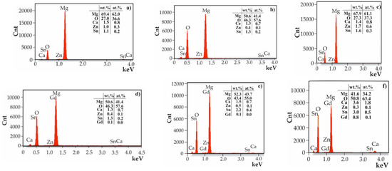Figure 5 presents the results of the EDS analysis for the SnO₂ thin films with various thicknesses applied to MgCa2Zn1 and MgCa2Zn1Gd3 alloys. The analysis indicated that the surfaces of the samples contained Mg, Ca, Zn, and Gd elements from the substrate alloys and Sn and O from the thin films. It can be observed that the Sn content increases in a uniform manner as the layer thickness increases, whereas the tin content is lower for the alloy that does not contain gadolinium (Figure 5a–c).