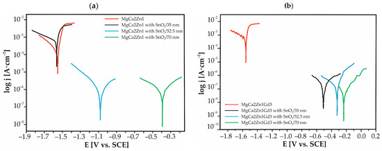 Polarization curves for the SnO2 thin films and uncoated Mg-based alloys in Ringer’s solution at 37 °C: (a) MgCa2Zn1 alloy; (b) MgCa2Zn1Gd3 alloy.