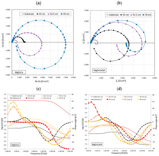 Nyquist plots for SnO2-coated MgCa2Zn1 (a) and MgCa2Zn1Gd3 (b) alloys and Bode plots for the same alloys (c,d) with coatings of 35 nm, 52.5 nm, and 70 nm thicknesses.