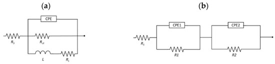 The electrical equivalent circuit used in the EIS analysis (Figure 8) was an inductive loop circuit used for all samples (Figure 8a), except for sample MgCa2Zn1/SnO2/35 nm where a circuit with two sections of constant phase element (CPE) in parallel and resistor in series was used (Figure 8b).