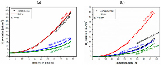 Hydrogen evolution volume as a function of immersion time in Ringer’s solution at 37 °C for 48 h for the SnO2 thin films applied to (a) MgCa2Zn1 and (b) MgCa2Zn1Gd3 alloys and uncoated alloys.