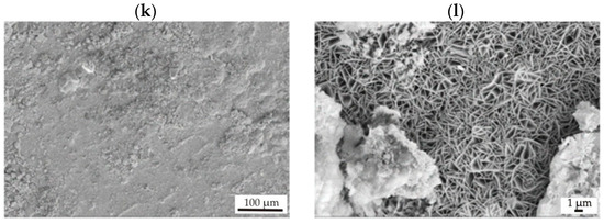 SEM images of samples’ surfaces with corrosion products of the SnO2 films applied onto MgCa2Zn1 alloy after (a,b) 1000 cycles, (c,d) 1500 cycles, and (e,f) 2000 cycles and MgCa2Zn1Gd3 alloy after (g,h) 1000 cycles, (i,j) 1500 cycles, and (k,l) 2000 cycles after 48 h of immersion in Ringer’s solution at 37 °C.