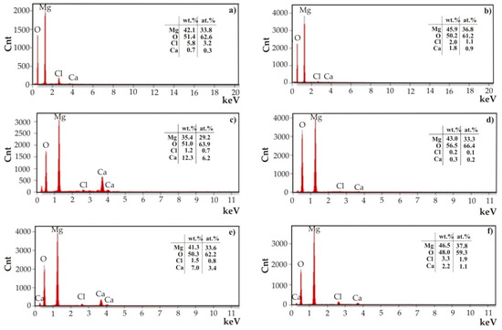 Observations of the corrosion products were supplemented by the EDS analysis (Figure 11). In the analyses, in addition to high intensities of reflections from oxygen and the main element of the substrate alloys (magnesium), small reflections of residues from the electrolyte in which corrosion resistance tests were performed (CaCl2 and NaCl) were observed. No reflections from Sn were identified, probably due to the long period of corrosion tests (48 h of immersion) for such thin nanometer layers. An evenly applied and tight coating provides initial protection against corrosion. Over time, when chloride ions from Ringer’s solution break the continuity of the nanometric protective coating, chemical reactions result in the formation of corrosion products, which also determine the corrosion resistance. In the case of this work, the SnO2 layers were very thin and porous. Nanopores in the films do not provide effective protection against corrosion and allow the penetration of chloride ions, leading to corrosion at the interface between the thin layer and the substrate, dissolving the protective layers.