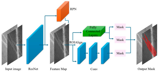 The Mask R-CNN [16] framework is structured around three core components: the backbone, the Region Proposal Network (RPN), and RoIAlign, illustrated in Figure 1. The architecture integrates a Feature Pyramid Network (FPN)-styled backbone designed to extract hierarchical image features [38,39,40]. The backbone predominantly comprises ResNet architectures, specifically ResNet41, ResNet50, ResNet65, and ResNet101 [41]. The configuration of ResNet50 includes 48 convolutional layers, complemented by one MaxPool and one Average Pool layer, supporting approximately 3.8 × 109 floating point operations.