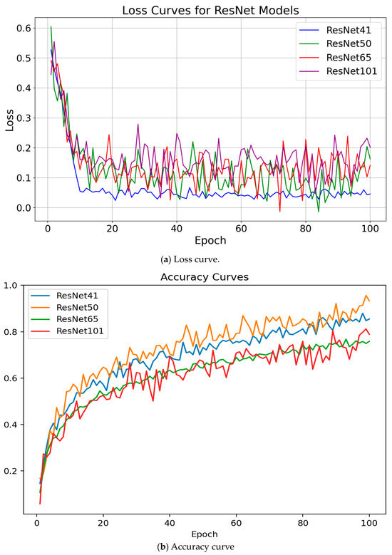 The metrics TP (true positive), TN (true negative), FP (false positive), and FN (false negative) are fundamental indicators used to measure the performance of the proposed models. The evaluation metrics such as the accuracy, specificity, recall, precision, and F1-score are summarized in Table 1. These values assess how effectively the deep learning model identifies invisible damage in thermal images. In the overview of model efficacy, ResNet50 emerges as the most accurate, boasting a 94.75% accuracy rate, which indicates its superior ability in making correct predictions. When it comes to specificity, ResNet101 leads the group with a rate of 90.95%, reflecting its proficiency in identifying instances where no damage is present. ResNet50 continues to excel with the highest precision of 95.60%, suggesting its predictions of damage are reliably accurate. Meanwhile, ResNet101 outperforms others in recall with a rate of 89.80%, showcasing its effectiveness in capturing all instances of actual damage within the dataset. The F1-score, a crucial indicator of a model’s balanced performance in precision and recall, is again topped by ResNet50, with an F1-score of 93.45%, indicating its consistent and reliable detection capability with minimal false identifications. These subscripted figures hint at further clarifications provided in the study, with ResNet50 generally demonstrating the best performance across multiple metrics, thus potentially offering a more refined tool for identifying structural integrity in civil engineering applications.