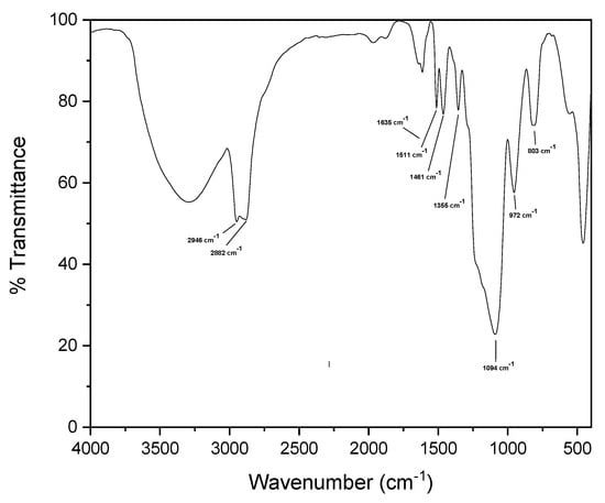 The FTIR spectrum (Figure 4) revealed characteristic vibrational modes of mesoporous silica structures. At approximately 3400 cm−1, a broad absorption band was observed primarily due to the stretching of the different kind of OH groups and related interacting water, along with a sharp peak at 1635 cm−1. Vibrations at 2946 and 2882 cm−1 were attributed to the C-H stretching of methylene and methyl groups, respectively, of the TX-100 template’s. The bands at 1463 cm−1 and 1511 cm−1 corresponded to methyl asymmetric bending, overlapped with scissoring of the methylene groups, while the symmetrical bending vibration of methyl groups was observed at 1355 cm−1. The most intense band at 1094 cm−1, accompanied by a shoulder at 1210 cm−1, was attributed to the symmetric and antisymmetric stretching of the Si-O-Si structure, along with a less intense signal at 803 cm−1. Finally, silanol peaks arising from the vibrational bending modes were observed at 972 cm−1 [32,33].