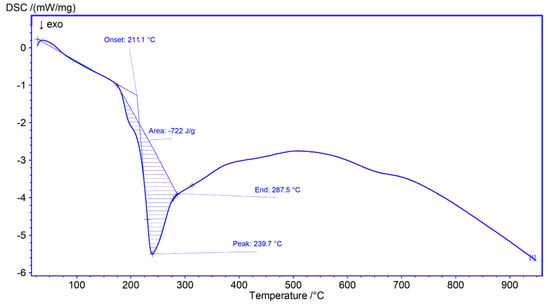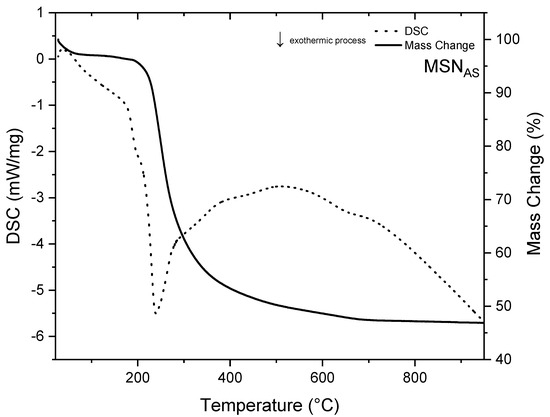 TG/DSC analysis (Figure 5) of the MSNAS sample showed a decrease of ~50% in mass, in the temperature range (200–950) °C, all attributable to TX-100 micelles, which decompose with an exothermic peak centered at 237.7 °C [34]. DSC values such as onset, peak, end, and enthalpy are depicted in Figure 6.