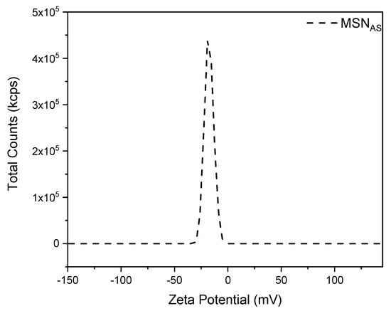The MSNAS samples exhibited zeta-potential values of approximately −18.00 ± 0.71 mV (Figure 7). Although absolute values below 30 mV may correlate with nanomaterials that exhibit a tendency to aggregate, it is important to note that zeta-potential values are not absolute indicators of suspension stability [35].