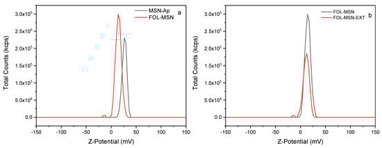 As can be observed from the data summarized in Table 1, starting from negative zeta-potential (Z) values of approximately −18.00 mV for the precursor MSNAS (Figure 7), primarily due to the presence of -OH groups on the nanomaterial surface [41], a positive Z value of about 27 mV was obtained in the sample subjected to surface grafting using 3-aminopropyltriethoxysilane (Figure 8a). This occurred because at pH 7, at which the zeta-potential measurements are recorded, the amino groups on the nanomaterial surface carry a positive charge, resulting in a positive surface charge [41,42]. Subsequent functionalization with folic acid exploits the chemistry of carbodiimides, in which folic acid is attached to the amino functionality by activating the carboxylic group of folate with N,N’-diisopropylcarbodiimide (DIC). The resulting amide is then bound to a suspension of MSN-AP, resulting in MSN-FOL (Figure 8a). Following this procedure, the surface charge on the nanoparticle is significantly reduced from +27 to +10 mV due to the reduction of the amino group previously present on the surface [43]. The subsequent removal of the template from the internal surface of the porous structure of the nanomaterial further releases silanol groups, but does not substantially affect the Z-potential value.