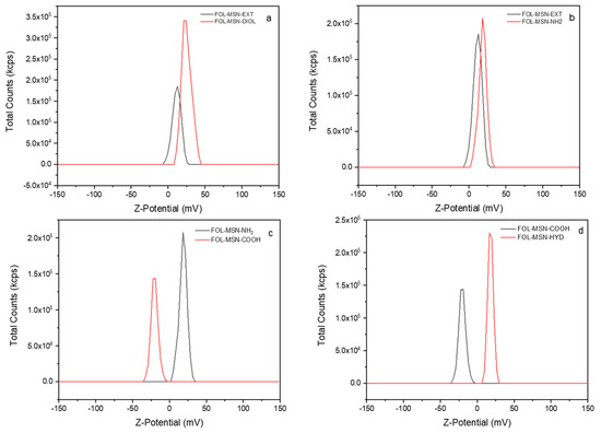 Z-potential graphs comparison of sample (a) FOL-MSN-EXT vs. FOL-MSN-DIOL; (b) FOL-MSN-EXT vs. FOL-MSN-NH2; (c) FOL-MSN-NH2 vs. FOL-MSN-COOH; (d) FOL-MSN-COOH vs. FOL-MSN-HYD.