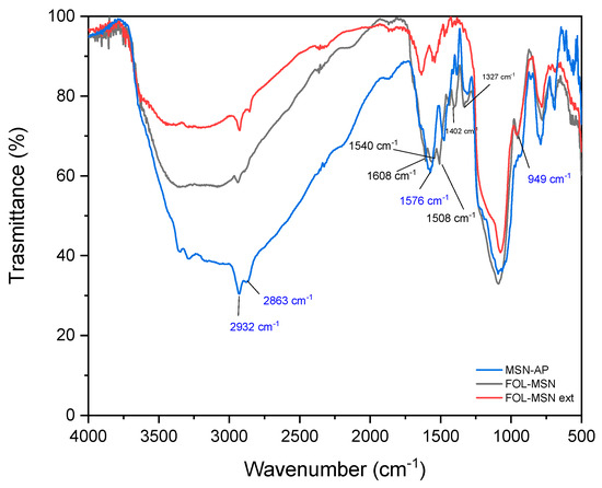 The FTIR spectrum of the functionalized FOL-MSN exhibited a peak approximately at 1540 cm−1, attributed to the vibration of aromatic rings (ν C=C) within folic acid. The N–H stretching band (around 3400 cm−1) overlapped with the (ν O–H) band. Within the FOL-MSN spectrum, bands ranging from 1608 to 1508 cm−1 were assigned to the stretching of C=N, the bending of N–H, and the bending of O–H, which also overlap [48]. The functionalization performed on the internal surface of the porous structures of the nanomaterial occurred only following a process of extraction in ultrapure water of the surfactant used for the synthesis of MSNAS. The extraction allowed obtaining a pore volume free from other molecules, with reactive hydroxyl groups that can be used for silanization operations. The peaks at 1402 cm−1 and 1327 cm−1, assigned respectively to the asymmetric and symmetric bending of the methyl group related to TX-100, were no longer visible in the MSN-FOL-EXT sample.