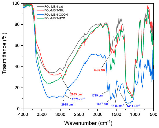 In Figure 12, the overlap between the FOL-MSN-EXT sample and the sample further functionalized with the addition of 3-aminopropyltriethoxysilane FOL-MSN-NH2 is evident. Since the grafting reaction occurs on a sample whose internal pores have been freed from the previously present surfactant through successive extractions in ultrapure water, we can reasonably assume that APTES primarily bonded with the free -OH groups present within the pores of the FOL-MSN-EXT nanomaterial. The FT-IR spectrum of FOL-MSN-COOH exhibited a broad transmittance band at approximately 3400–3200 cm−1 due to -OH and -NH stretching, and weak bands at 2938 and 2878 cm−1 due to -CH stretching frequencies. The stretching bands of amidic carbonyl and carboxylic carbonyl (C=O) occurred at approximately 1650 cm−1 and 1700 cm−1, respectively. The -NH bending vibration was observed at 1446 cm−1, and the -CH bending vibrations were observed at around 1411 cm−1. The presence of these transmittance bands indicates the presence of amidic succinic acid moiety on the surface of FOL-MSN-COOH [50]. For the FOL-MSN-HYD sample, it can be observed that this exhibit showed almost overlapping bands and peaks with FOL-MSN-COOH, as both samples carry very similar chemical functionalities. The differences that can be observed include, for example, the presence of a much more intense band in the range of 3400–3200 cm−1, and were mainly due to the stretching of the free -OH groups present in the carboxylic functionality of FOL-MSN-COOH and less intense in FOL-MSN-HYD. Peaks at around 1600–1650 cm−1, typical of carbonyl stretching of amides, were present in both spectra as functionalities in both samples. Anyway, the most noticeable difference in this spectrum cannot be shown because the peak at around 1110 cm−1, which is typical of the stretching of the N-N bond of the free hydrazine functionality, was hidden by another absorption band [51].