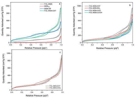 Adsorption isotherm overlap of (a) MSNAS, MSN-AP, FOL-MSN and FOL-MSN-EXT samples; (b) FOL-MSN-NH2, FOL-MSN-EXT, FOL-MSN-COOH, and FOL-MSN-HYD samples; (c) FOL-MSN-EXT vs. FOL-MSN-DIOL samples.