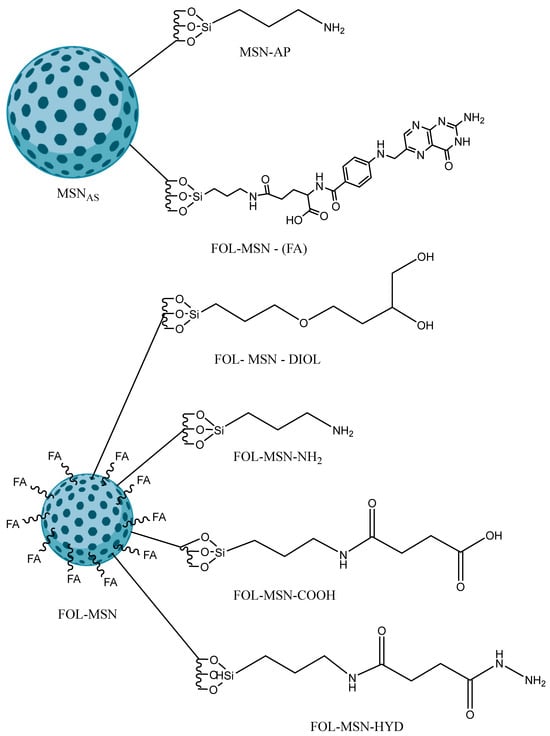Amino-propyl triethoxysilane (APTES) and folic acid (FA) were introduced onto the nanoparticles and the samples (MSN-AP and FOL-MSN) were characterized either before and after the template extraction in water (FOL-MSN-EXT); FOL-MSN-EXT was functionalized with 3-glycidoxypropyltrimethoxysilane to obtain the corresponding diol (FOL-MSN-DIOL) and again with APTES (FOL-MSN-NH2) and characterized.
