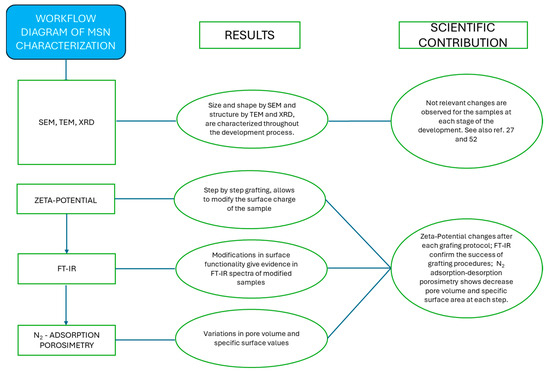 In Scheme 3, the results acquired in the presented multistep development of hybrid nanostructured materials are connected with their scientific contribution. It can be ob-served that the higher significance derived from zeta-potential, FT-IR spectroscopy, and nitrogen adsorption-desorption analyses. These analyses, in fact, related to a relevant scientific contribution to the characterization of the obtained materials. The electronic mi-croscopies (SEM and TEM), powder X-ray diffraction, and 29Si-NMR spectroscopy, on the other side, were shown to be not significantly affected by multistep modification procedures, as we showed in detail in our previous works [27,52]. The results revealed significant variations in the surface characteristics of MSNPs following each post-synthesis operation. Zeta- potential measurements indicated changes in surface charge distribution, suggesting alterations in the material’s colloidal stability and potential interactions with surrounding environments.