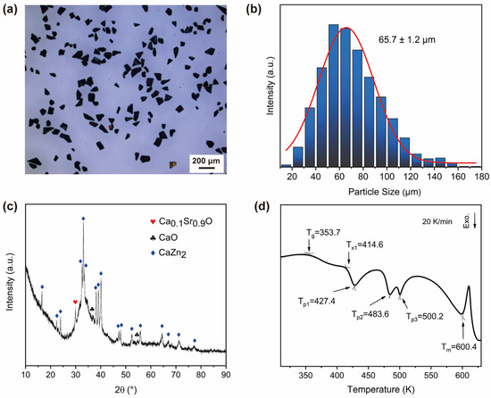 Figure 1 shows the macroscopic characterization results for the prepared powder sample to identify the phase composition. After manual grinding, the as-spun ribbons turn into small particles without irregular shapes (Figure 1a). Using Image Pro Plus software to analyze the particle size, a histogram of the particle size distribution was obtained, as shown in Figure 1b, indicating a particle size range of approximately 20 μm to 180 μm, with an average size of 65.7 μm. The XRD test result shown in Figure 1c indicates the presence of diffuse scattering in the pattern between 30° and 40°, suggesting the presence of a certain amount of the glassy phase. In addition, the XRD pattern shows sharp diffraction peaks corresponding to the crystalline phases CaZn2, Ca0.1Sr0.9O, and CaO, with weaker oxide peaks indicating low content. Oxides may originate from O impurities in the Ca and Sr raw materials, as they have a strong chemical affinity with oxygen and are easily oxidized during storage and transportation. The DSC curve in Figure 1d indicates that the powder sample undergoes a significant glass transition and a polycrystalline transition during continuous heating, with a glass transition temperature Tg of 353.7 K and an onset crystallization temperature Tx1 of 414.6 K. This confirms the presence of a large amount of the glassy phase in the sample and validates the results in Figure 1c. In brief, this indicates that the prepared powder sample is a composite material consisting of an MG phase and a CaZn2 crystalline phase.