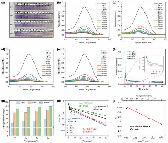 (a) Optical photos of residual solutions degraded for different times at different temperatures; (b–e) absorption spectra of residual solutions degraded for different times at 0, 20, 40, and 60 °C, respectively; (f) relative absorbance vs. degradation time curves at different temperatures; (g) azo dye removal rate; (h) degradation reaction kinetics curves at different temperatures, fitted according to second-order reaction kinetics equations; (i) Arrhenius equation fitting diagram.