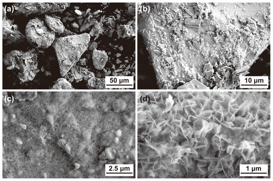 SEM images of the Zn45Mg11Ca40Sr4 alloy powder after degrading DB6 for 60 min at different magnifications: (a) 500×; (b) 2000×; (c) 10,000×; (d) 20,000×.