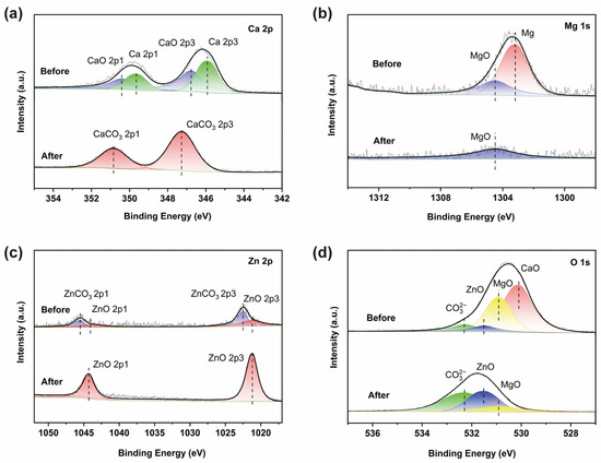 Considering that the degradation reaction of the azo dyes is concentrated on the surface of the powder and there are fewer degradation products, XPS suitable for thin-layer samples was used to test the alloy powder before and after the azo dye degradation experiment. Figure 4a shows that the Ca element on the surface of the sample existed in the form of the zero-valent metal Ca and the oxide CaO before the reaction and was completely transformed into CaCO3 after the reaction. Figure 4b shows that the Mg element exists in the form of metallic Mg and MgO in the sample. After reacting with the azo dye solution, the zero-valent metal Mg is consumed in large quantities and disappears. On the contrary, the peak intensity of ZnO significantly increased after degradation by the azo dyes, as shown in Figure 4c, indicating that more Zn elements were exposed on the surface of the sample in the form of oxides. In addition, the changes in the binding energy of the O element in the samples before and after the degradation test of the azo dyes are shown in Figure 4d, which further proves that the Mg and Ca elements on the surface of the samples are greatly consumed during the reaction process, leading to an increase in the relative content of ZnO (with a lower Sr content and no corresponding information detected).