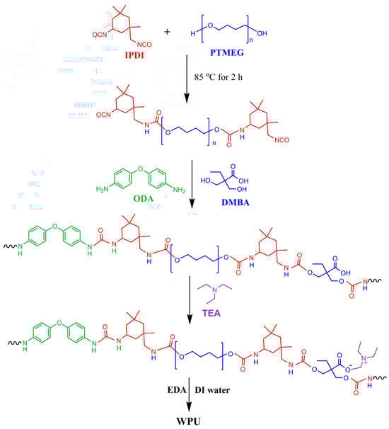 A total of 40 g PTMEG and 12.3 g IPDI were reacted in a three-necked flask at 85 °C for 1.5 h. After being cooled to 60 °C, 3 g DMBA dissolved in 10 mL acetone was introduced into the mixture and reacted for 1 h. Then, 1.94 g ODA dissolved in 10 mL was added and reacted for another 1 h. Finally, 2.04 g TEA, 0.2 g EDA and 73 g deionized water were added and stirred at 1000 rpm for 20 min. WPU with 45% solid content was procured after removing acetone in a vacuum. Figure 1 shows the synthesis procedure of WPU.