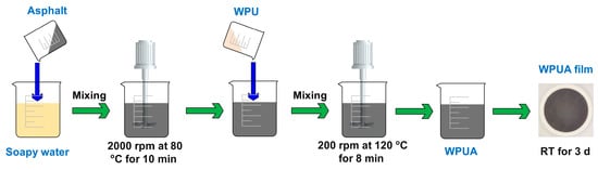 To prepare WPUA, both WPU and asphalt emulsion were heated to 120 °C and mixed at 200 rpm for 8 min. Afterward, the mixture was poured into a circular Teflon mold with a height of 5 mm and a diameter of 100 mm and kept at room temperature (RT) for 3 d to prepare the WPUA film. The asphalt contents in WPUAs were 0, 30, 40 and 50 wt%, respectively. Figure 2 presents the preparation procedure for the WPUA film.