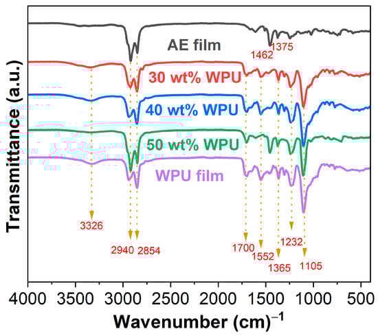 The FTIR spectra of asphalt emulsion, WPU and WPUA films are depicted in Figure 3. For asphalt emulsion, the double peaks at 2940 and 2854 cm−1 represent methyl (–CH3) and methylene (–CH2–) groups. –C=O of carbonyl, ester, aldehydes, ketones or amides is observed at 1671 cm−1. C=C of aromatics is shown at 1607 cm−1. The bonds at 1462 and 1375 cm−1 are attributed to aliphatic CH2 and CH3 [43]. For WPU, apart from the –CH3 and –CH2– groups at 2940 and 2854 cm−1, the stretching vibration of –NH is seen at 3326 cm−1. The peaks at 1700 cm−1 and 1552 cm−1 are related to –C=O and –CONH, respectively. Furthermore, the bonds at 1365 and 1232 cm−1 represent bending vibrations of methyl groups, while the stretching vibration of –COC– is shown at 1105 cm−1 [24,44]. In terms of WPUAs, all characteristic peaks of both asphalt emulsion and WPU exist. It is important to note that the peak at approximately 2250 cm−1 is not found in the spectra of either WPU or WPUAs, indicating that the toxic –NCO groups fully reacted during the preparation of WPU. Therefore, both WPU and WPUAs are environmentally friendly. Furthermore, it is known that the hydroxyl groups in asphalts react with –NCO groups [45]. Therefore, using non-solvent polyurethane to modify asphalt binder is a chemical process. However, the preparation of WPUAs is a complete procedure of physical mixing since all –NCO groups in WPU had been reacted, as shown in Figure 3. This indicates that there is no chemical interaction between WPU and asphalt emulsion.