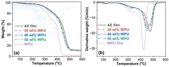 The TGA and DTG (derivative thermogravimetry) curves of asphalt emulsion, WPU and WPUA films are illustrated in Figure 4. The TGA curve of the WPU film is nearly beneath the AE film as shown in Figure 4a, indicating that the WPU film has poorer thermal stability than the AE film. As shown in Figure 4b, the AE film undergoes two-stage thermal composition, while the WPU film thermally degrades under three stages. For the AE film, the first stage takes place from 100 to 150 °C, assigned to the oxidation of the solvent within the film. The second decomposition stage in the temperature range of 250–550 °C is related to the degradation of larger molecules of asphalt binder [46,47]. In terms of the pure WPU film, the first decomposition stage takes place at 240–290 °C, relating to the pyrolysis of rigid segments of urethane and urea groups. The second decomposition stage occurs at 290–380 °C, assigned to the pyrolysis of soft segments. The third decomposition stage occurs at 380–480 °C, correlating to the gasification of residual organic compounds [48]. Because of the combined influence of AE and WPU, WPUAs also show a three-stage degradation, as shown in Figure 4b. More importantly, as shown in Figure 4a, the TGA curve of the WPU film is beneath those of all WPUA films over the entire range of temperatures, indicating that the WPU film has the worst thermal stability in comparison to both AE and WPUA films.
