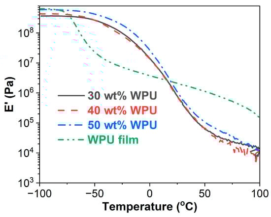 The E′ versus temperature curves of the WPU and WPUA films are shown in Figure 5. The E′ of the WPU film is higher than those of the WPUA films in the temperature ranges of −100–−80 °C and 15–100 °C. However, in the temperature range of −80–15 °C, the E′ of the WPU film is lower than that of the WPUA films. In a DMA measurement, storage modulus relates to Young’s modulus of materials and indicates the elasticity and stiffness of materials [49]. This means that the WPU film has better elasticity and higher stiffness than the WPUA films in the temperature ranges of −100–−80 °C and 15–100 °C. However, an opposite trend is observed in the temperature range of −80–15 °C. For the WPUA films, the film with 50 wt% WPU has a higher E′ value than those with 30 wt% and 40 wt% WPU, while the films with lower WPU concentrations exhibit similar E′ values in the whole temperature range.