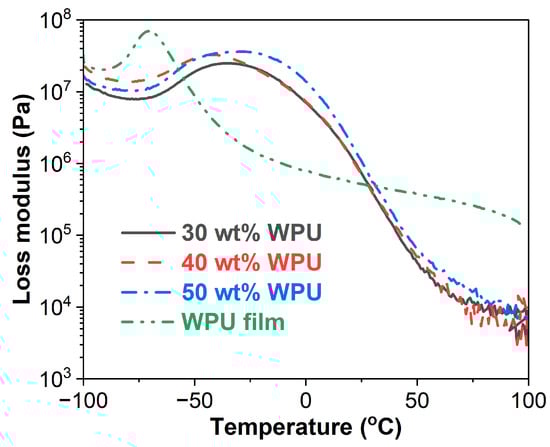 For polymeric materials, E″ represents the ability to dissipate energies and is sensitive to molecular motions, glass transitions, relaxation, morphology and structural heterogeneity [50,51]. In this context, the temperature of E″ is often chosen to represent the glass transition temperature [50]. As shown in Figure 6, the WPU film has a lower Tg than the WPUA films. For the WPUA films, there is no linear relationship with WPU concentrations. The Tgs of WPUAs with 30 wt%, 40 wt% and 50 wt% WPU are −35.3 °C, −42.2 °C and −28.7 °C, respectively.