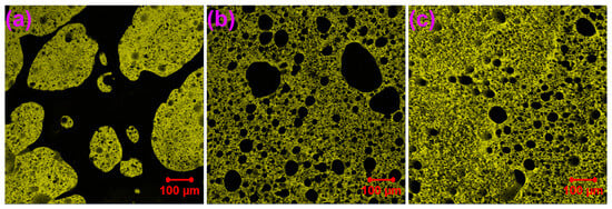 Figure 7 shows LSCM images of WPUAs. As shown in Figure 7a, for WPUA with 30 wt% WPU, some yellow WPU particles disperse in the black asphalt phase. That is to say, WPU particles act as the discontinuous phase, while asphalt behaves as the continuous phase. The dispersion of WPU particles is random. The size of some WPU particles is extremely large, indicating that the dispersion of WPU particles is near the co-continuous stage. With the further increase in WPU concentration, phase inversion occurs, meaning that WPU becomes the continuous phase, whereas asphalt particles turn to the discontinuous phase, as shown in Figure 7b,c.