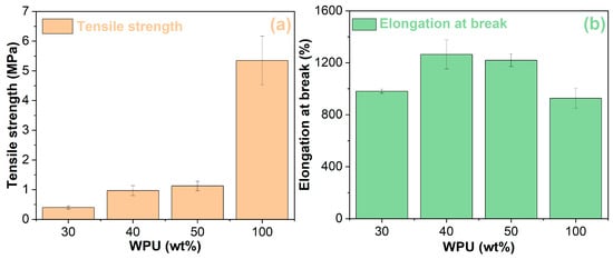 Figure 8. Mechanical properties of the WPU and WPUA films: tensile strength (a) and elongation at break (b).