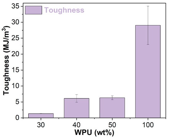 Figure 9 shows the toughness of the WPU and WPUA films. The inclusion of asphalt emulsion significantly reduces the toughness of the pure WPU film. The toughness of the WPUA films decreases with lower WPU concentration. Due to the occurrence of phase inversion, the toughness of the WPUA film with 40 wt% WPU is 369% higher than that of the film with 30 wt% WPU.