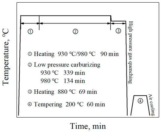 A high carburizing temperature of 980 °C was used in this work, and the usual carburizing temperature of 930 °C was also conducted for comparison. The low-pressure carburizing process was carried out in the SynchroTherm type low-pressure carburizing furnace produced by ALD Vacuum Technologies GmbH (Hanau, Germany), and the detailed carburizing process was illustrated in Figure 1.