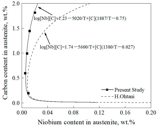 On the other hand, linear fitting was used to fit the [Nb][C] solid solubility product equation with different carbon content according to the result of extraction phase analysis, and the solid solubility product equation is expressed as [18]: