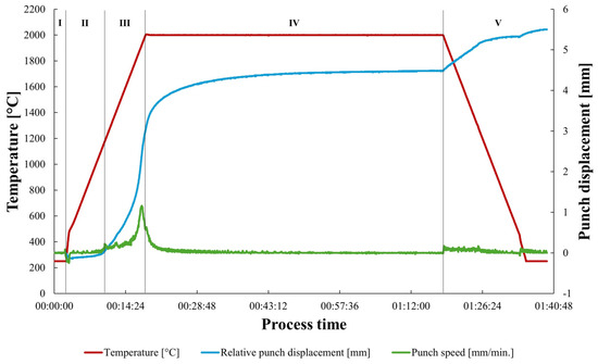 The first segment of the sintering process involves waiting for the temperature to reach 250 °C, the lowest temperature detectable by the installed pyrometer, which explains the flat temperature line. In the second segment, a slight negative piston movement occurs due to the thermal expansion of the graphite die and punches, while the temperature remains too low to induce densification. The third segment marks the beginning of powder densification through mass transfer and neck formation, evident by a substantial relative displacement of the piston and an increase in punch speed. The fourth segment coincides with the sintering dwell time, where the sintering curve flattens, indicating that the dwell time is sufficient and a high rate of densification has been achieved. The final segment involves the cooling of the samples, set at a speed of 250 °C/min to prevent cracking due to thermal stresses.