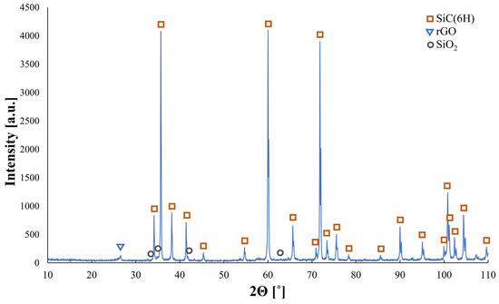 Exemplary phase analysis of composite containing 2 wt.% rGO. Three phases were detected: the matrix phase–SiC (6H polytype), the reinforcement phase–rGO, and a trace amount of SiO2.